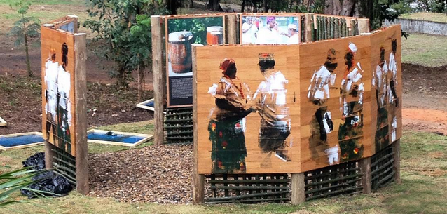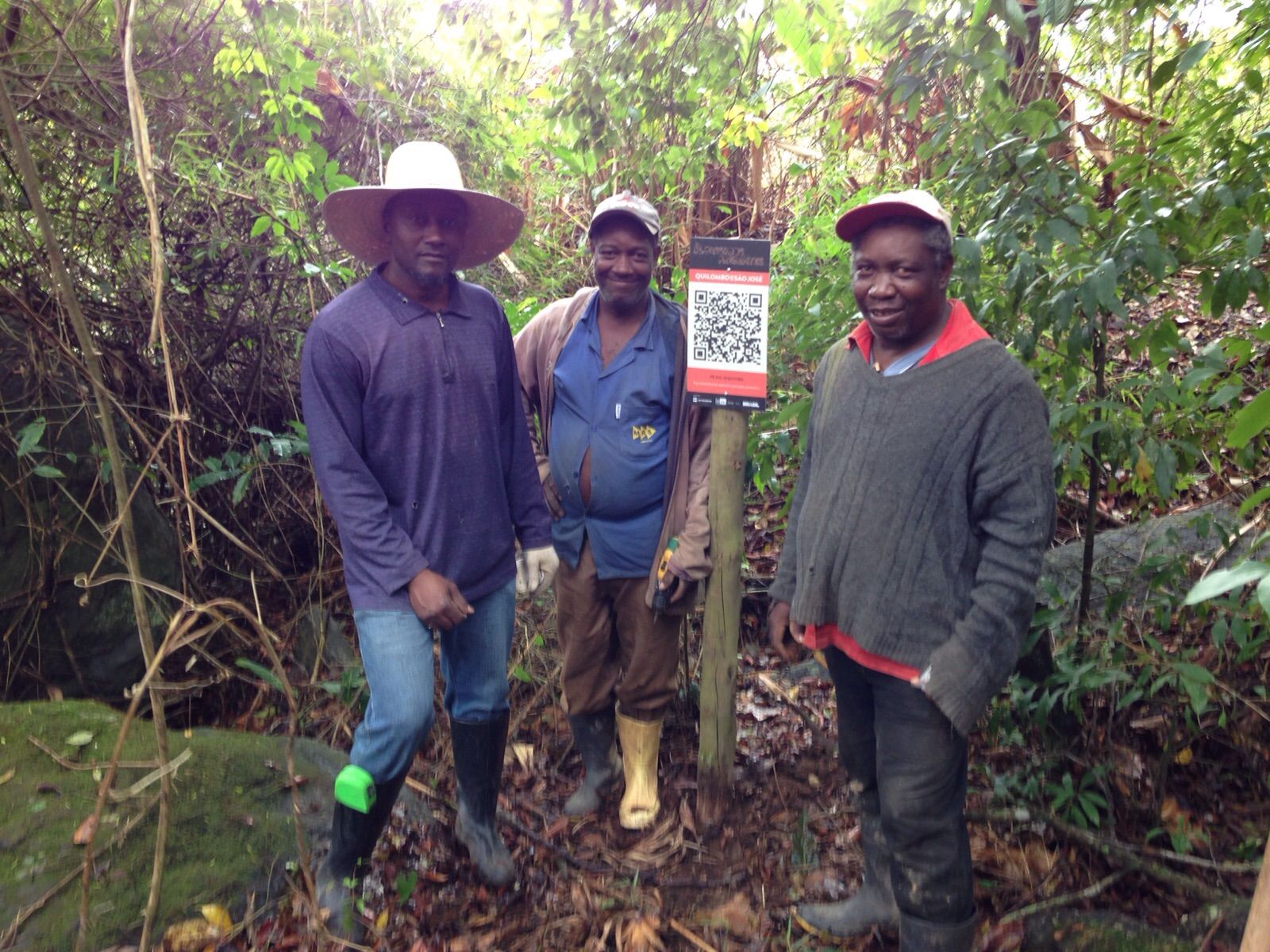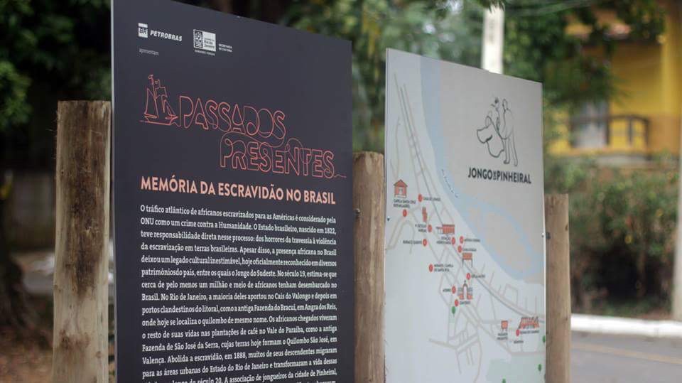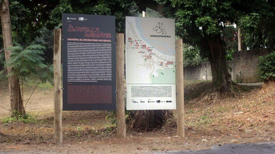 A roda expositiva conta também a história da luta da comunidade pela terra coletiva ao longo do século 20. Na década de 1970, a construção da Rio Santos lhes tirou, não sem luta, toda a terra que ocupavam da estrada até o mar. Ainda hoje, o território comunitário continua ameaçado apesar da certificação da Fundação Palmares como comunidade quilombola. Três da placas do projeto Passados Presentes foram arrancadas poucas horas após terem sido colocadas. Tais locais de memória continuam sinalizados no roteiro do aplicativo e, felizmente, encontram-se fora da área que vem sendo negociada com o INCRA para demarcação definitiva. Esperamos que isso aconteça o mais rápido possível. Enquanto não acontece, a sinalização do projeto Passados Presentes atualiza a memória do território histórico ocupado pela comunidade e a fortalece para a futura titulação de acordo com a Constituição de 1988.